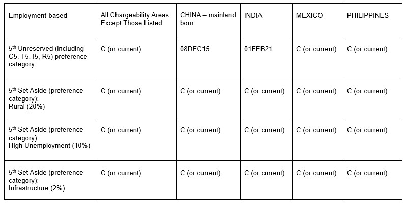 Note it is only the “Unreserved” preference category in EB-5 that shows a cutoff date. The new reserved preference categories for EB-5 all show as ‘C’ or “Current”, meaning anyone who has an approved EB-5 petition related to the new reserved visas created by the RIA can start the process to immigrate to the US, even those from China and India.
